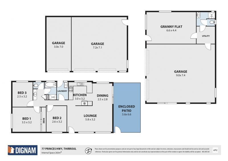 Side access to the home and the abundant storage options combine to create a versatile property which could be used for a myriad of purposes. At the front of the property is a 3 car garage, ideal for parking and storage, whilst a larger 9m x 7.4m garage is located at the rear of the property and is a suitable base for a home office/studio. The rear shed also adjoins a possible guest space or studio which features a shower and toilet, and access to a utility room.