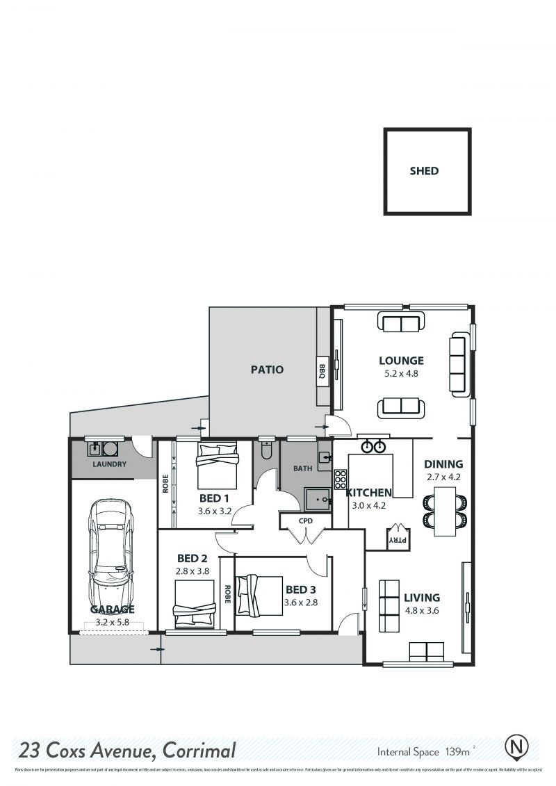 The three double bedrooms include two with built-in robes and are serviced by the centrally positioned bathroom, while the secure garage and walk-in laundry add extra appeal.