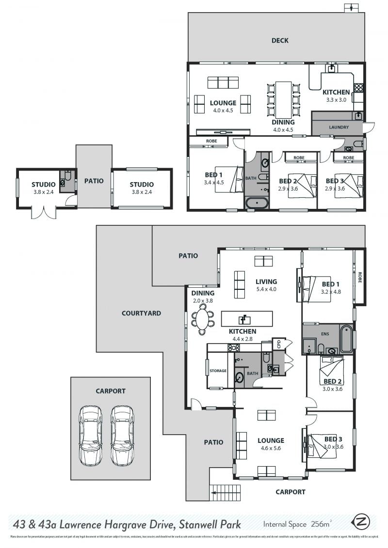 • A secondary residence: This property includes a separate beautifully designed three-bedroom, 1 bathroom home with accommodation for 2 cars. This property currently generates $850 p/w with an annual income of $44,200. (43A Lawrence Hargrave Dr)
